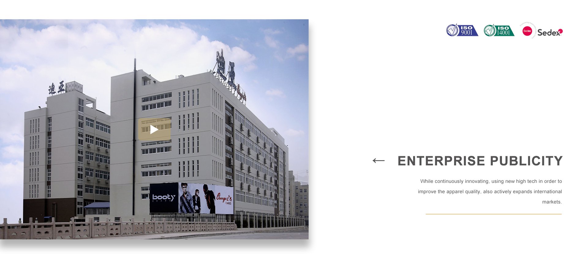 品牌建設是公司堅持不懈的追求,我們每年都會積極參加國內外舉辦的各大服裝展銷會。憑借著良好的質量與信譽,市場占有率在逐漸擴大,產品遠銷歐洲、美洲、亞洲等國。公司以生產棉衣、羽絨服、派克、大衣、夾克、運動休閑服飾等為主,旗下主打品牌有 ORANGE D’OR 、CLAIRVAL、BOOTY JEANS 、S&V和SASAEC,各品牌服飾均以典雅的色彩、優(yōu)美的線條、卓越的魅力吸引著都市麗人,將時尚、經典的潮流信息予以淋漓盡致的演繹。